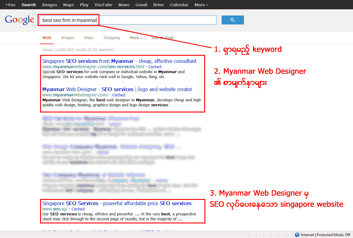 ဒီနေ့တော့ Google ရဲ့ လျှို့ဝှက်ချက်လေးတစ်ခုကိုပြောချင်လို့ပါ။ အဲဒီလျှို့ဝှက်ချက်ကို မပြောခင် နည်းနည်းစမ်းကြည့်ရပါမယ်။ www.google.com မှာ “best seo firm in myanmar” ဆိုတဲ့ keyword နဲ့ ရှာကြည့်ပေးပါ။ အောက်ပါပုံအတိုင်းထွက်လာမယ်ဆိုရင် အောက်မှာရေးထားတဲ့ Google ရဲ့ လျှို့ဝှက်ချက်ဆိုတာကို ထပ်ဖတ်ပါ။