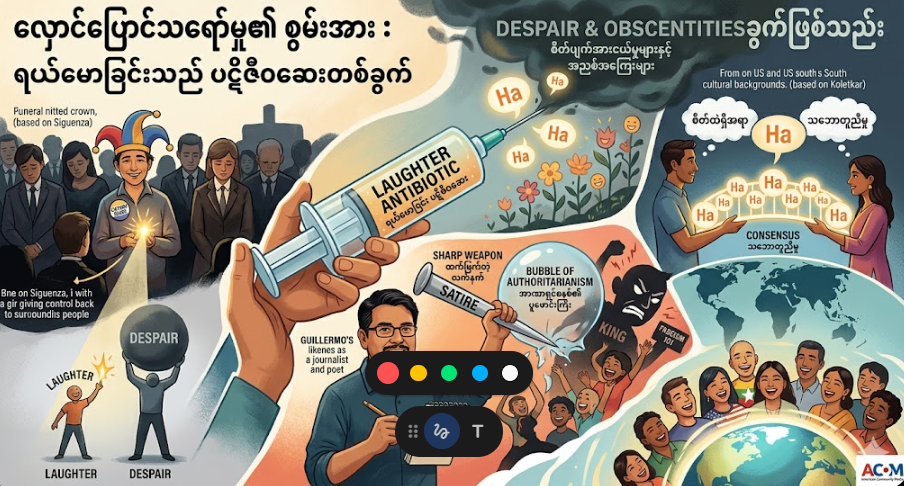 နက်ရှိုင်းသော အညစ်အကြေးများနှင့် ပြည့်နှက်နေသော ခေတ်ကာလများတွင် ဟာသသည် စိတ်ပျက်အားငယ်မှုများအတွက် အကောင်းဆုံး ခုခံကာကွယ်မှု (Defense Mechanism) ဖြစ်နိုင်ကြောင်း ဆွေးနွေးပွဲကို ၂၀၂၆ ခုနှစ်၊ မတ်လ ၆ ရက်က အမေရိကန် (US) အခြေစိုက် American Community Media (ACoM) က ဦးစီးကျင်းပခဲ့သည်။